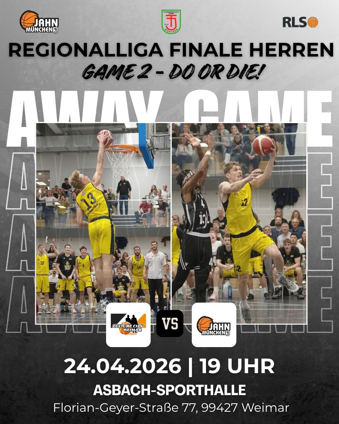 Am Freitag, den 24.04.2026 reisen die Jahn-Männer nach Weimar, um im Kampf um den Titel in der 1. Regionalliga Südost nach der knappen Hinspielniederlage in München den ersten Sieg der Finalserie zu erringen. Hierbei geht es nicht einfach nur um eine Revanche am Thüringischen Topfavoriten, sondern vor allem darum, die Serie ins entscheidende dritte Spiel zu schicken. Das Spiel am Freitag steigt um 19:00 Uhr in der Asbachhalle und bereits am Sonntag, dem 26.04.2026, käme es um 17:00 Uhr zum finalen Aufeinandertreffen.