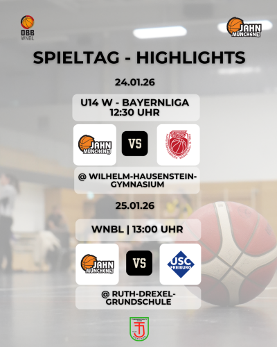 Jede Menge Jugend-Basketball in der Ruth-Drexel-Schule (z.B. Sonntag 13:00 WNBL gegen Freiburg) und im neuen Wilhelm-Hausenstein-Gymnasium (z.B. Samstag 12:30h U14w gegen Fürstenfeldbruck)