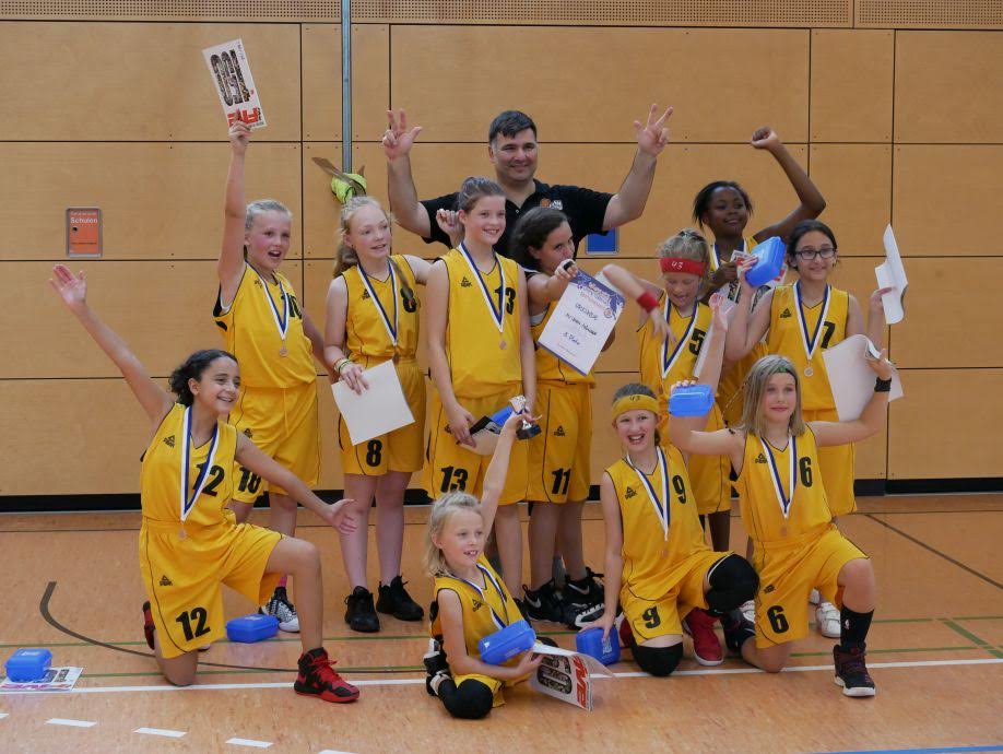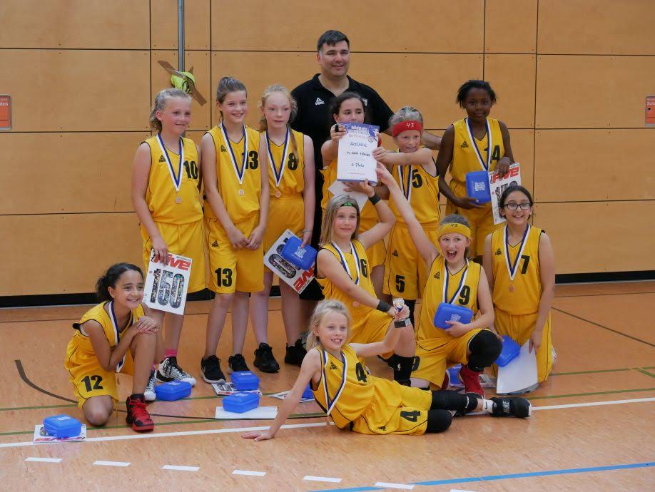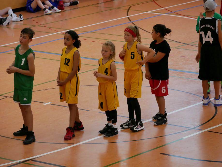 Der letzte Gegner hieß dann Freising. Auch hier entwickelte sich ein enges Spiel. 6:9 zur Halbzeit hinten, dann auf 9:9 ausgeglichen. Ewa und Leni erkämpften wie immer einige Sprungbälle durch ihre agressive Defense, Hana traute sich immer öfter, den Korb zu attackieren. Es ging hin und her, am Ende dann ein glücklicher 17:14 Sieg für uns. Nun wurde es spannend, denn mit Staffelsee, den Hellenen und uns hatten drei Teams jeweils 3 Siege eingefahren und die Korbdifferenz mußte entscheiden. Da waren wir leider 2 Körbe hinter den anderen Teams und holten uns somit den 3.Platz. Aber trotzdem war der Jubel groß, unsere Jahn Mädls haben toll zusammengespielt und alles gegeben. Das läßt hoffen für die neue Saison im Oktober!