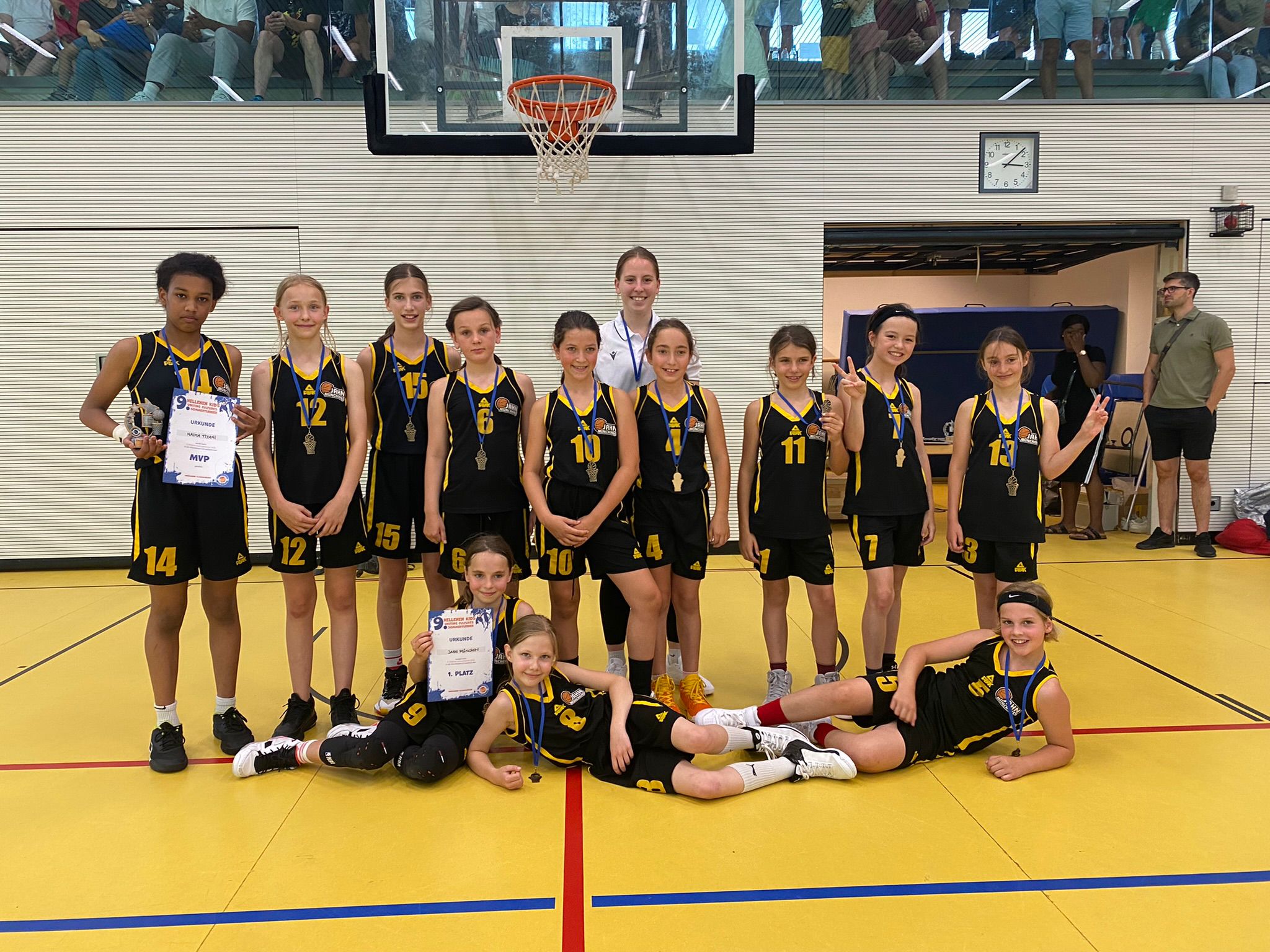 Dabei wurde gegen jede Mannschaft gleich doppelt gespielt und so gab es genug Spielzeit & bei den hohen Temperaturen ebenso wichtige Pausen für alle. Trotz einiger erst frisch aus der U10 hinzugestoßenen Spielerinnen haben die Mädchen bereits sehr gut miteinander harmoniert. Alle vier Spiele konnten am Ende siegreich gestaltet werden, sodass die nunmehr ältesten Jahn-Minis neben viel Einsatzzeit also sogar den Turniersieg bejubeln konnten. Naima wurde darüber hinaus als MVP, also wertvollste Spielerin des Turniers, ausgezeichnet.