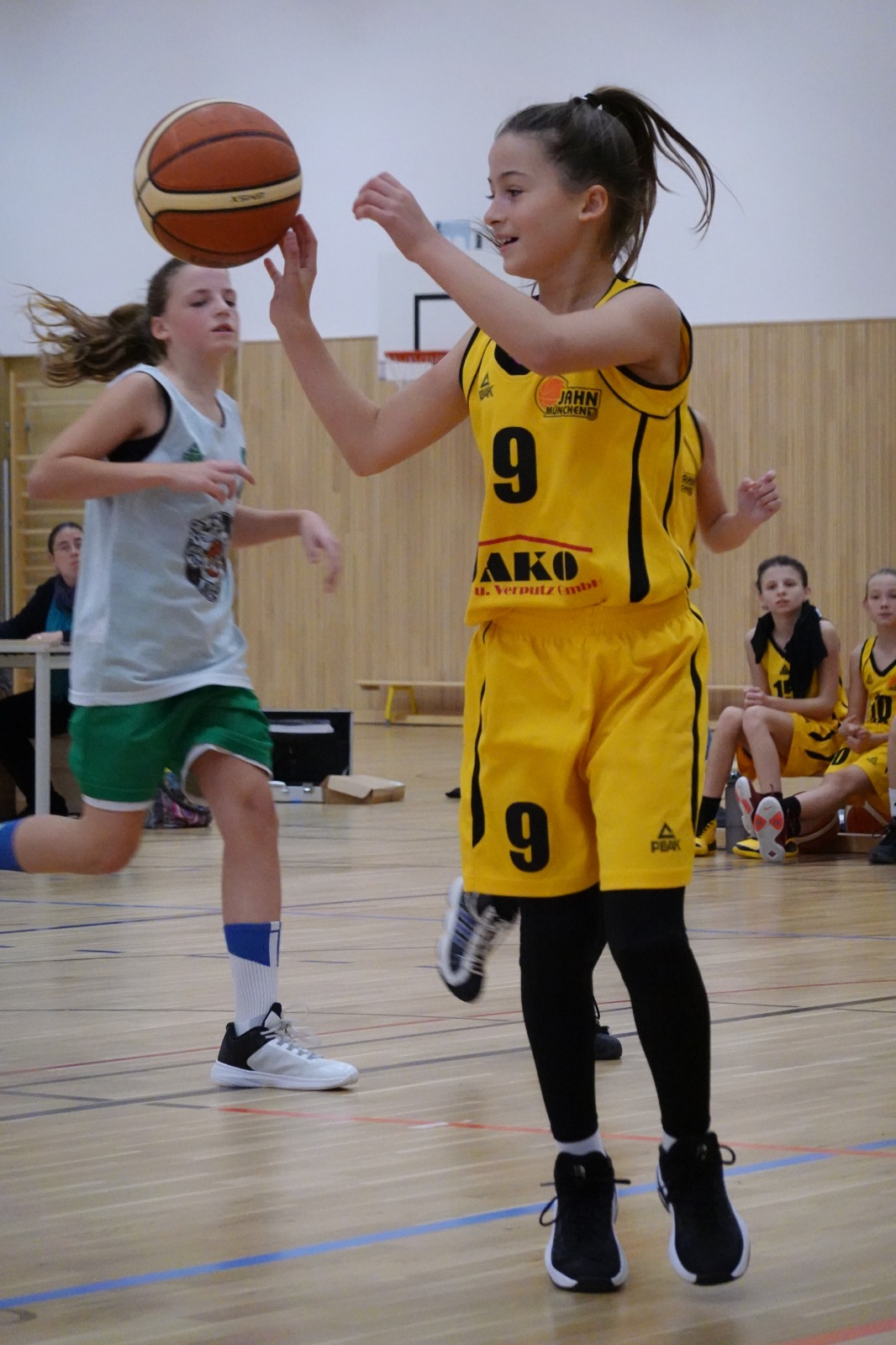 9 Jahn Mädchen der u12 weiblich liefen zum Saisonauftakt in der heimischen Halle gegen das neue Team vom Ackermannbogen auf. Nach verhaltenem Start im ersten Achtel (es wurde nach neuen Miniregeln gespielt) und einem 10:13 Rückstand, kamen die Jahnler immer besser in Fahrt. Tolles Teamplay mit schnellen Pässen führte zu einfachen Korberfolgen und der Vorsprung wuchs. Die Gäste konnten nur zu sechst antreten und ab der Halbzeit schwanden die Kräfte, aber es wurde tapfer weitergespielt und um jeden Ball gekämpft. Der Sieg viel dann mit 120:36 recht hoch aus, aber alle Spielerinnen hatten sich den Applaus von der Tribüne verdient.