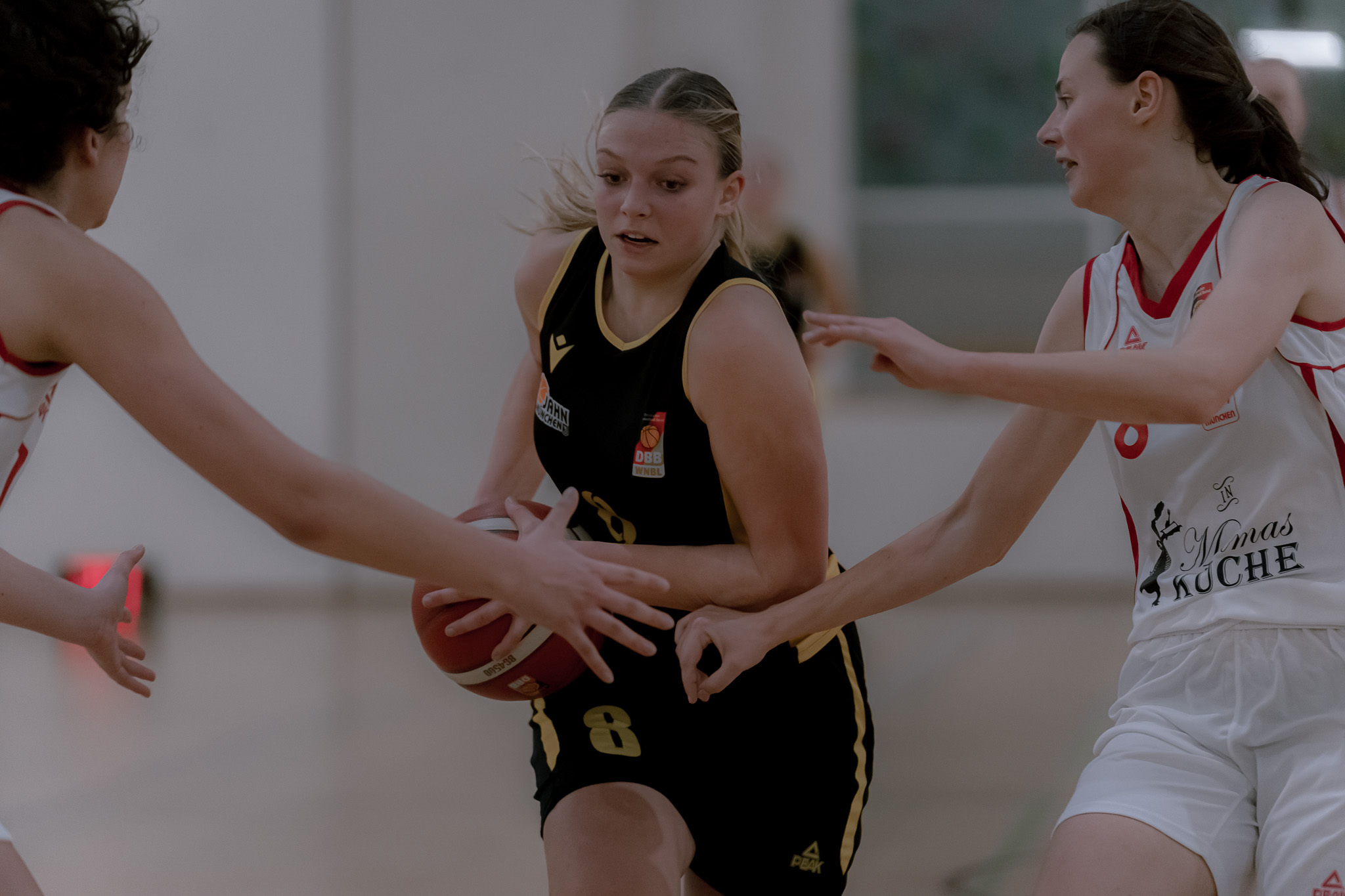 Hiernach folgte die wohl rückblickend stärkste Münchner Phase. Neben weiterhin engagierter Verteidigungs-Arbeit entstanden aus gutem mannschaftlichem Zusammenspiel immer wieder freie Wurf-Abschlüsse. Gleich vier erfolgreiche Distanztreffer sowie schnelle Punkte aus dem eigenen Umschaltspiel ließen den Vorsprung in diesen Sequenzen gar zweistellig anwachsen (48 – 38). Nach diesem gleichermaßen kräftezehrenden Zwischenspurt ließen die Münchner Kräfte allerdings zusehends nach, verletzungs- sowie foulbedingt schrumpfte die eigene Rotation innerhalb kürzester Zeit auf nur noch fünf einsatzfähige Spielerinnen zusammen. Diese waren zwar bei Leibe redlich bemüht, die Gäste unter Regie des baden-württembergischen Landestrainers Thomas Adelt konnten sich im Folgenden jedoch immer wieder entscheidende zusätzliche Wurf-Chancen erarbeiten.