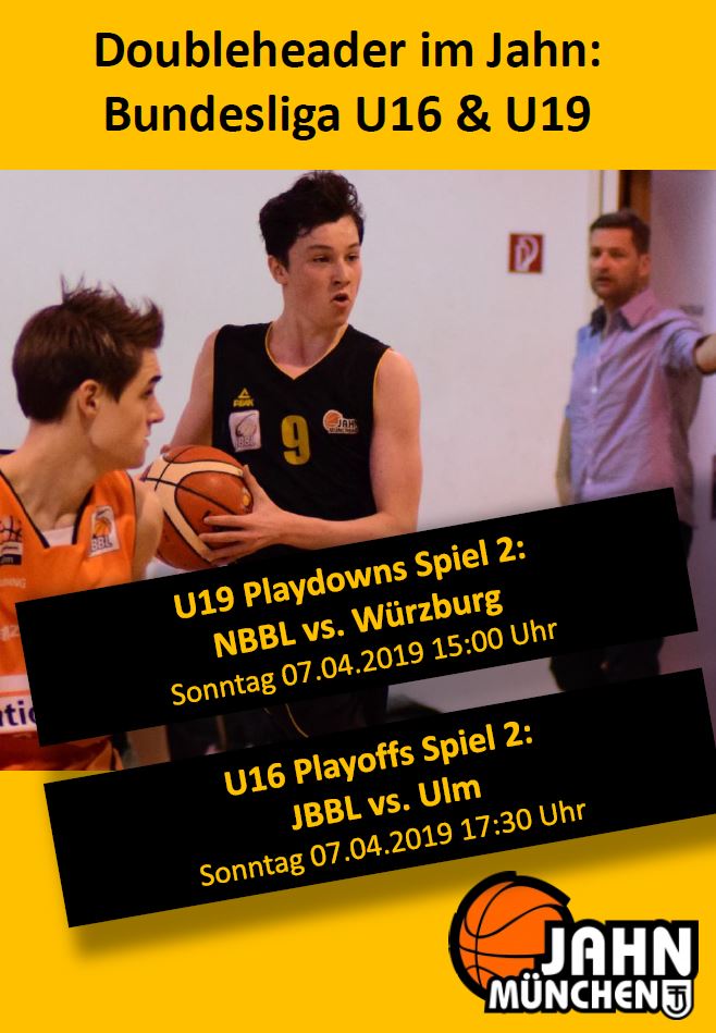 Der Sonntagnachmittag ist gerettet: Playdowns für unsere U19- Jungs, Playoffs für unsere U16-Jungs. Während die Großen gegen Würzburg um den Abstieg spielen, möchten die Kleinen das Viertelfinale um die Deutsche Meisterschaft erreichen. Beide Teams haben das erste Spiel der jeweiligen Serie verloren und können diese vor heimischem Publikum nun ausgleichen. Im Falle eines Sieges käme es eine Woche später auswärts zum Entscheidungsspiel in Würzburg bzw. Ulm.07. April 201915.00 Uhr: NBBL - Würzburg17.30 Uhr: JBBL - Ulm